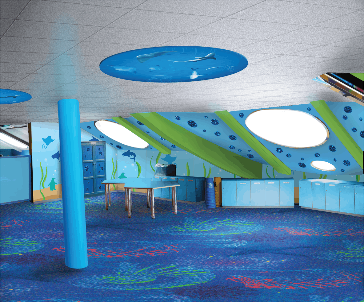In order to reduce costs and simplify the renovation process, we kept the architectural integrity of the space intact and cosmetically transformed the space through material change and custom graphic application to create the new Camp Ocean branded Marine experience.