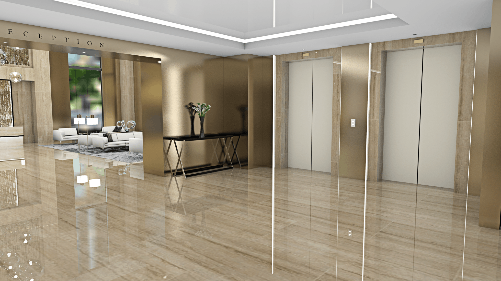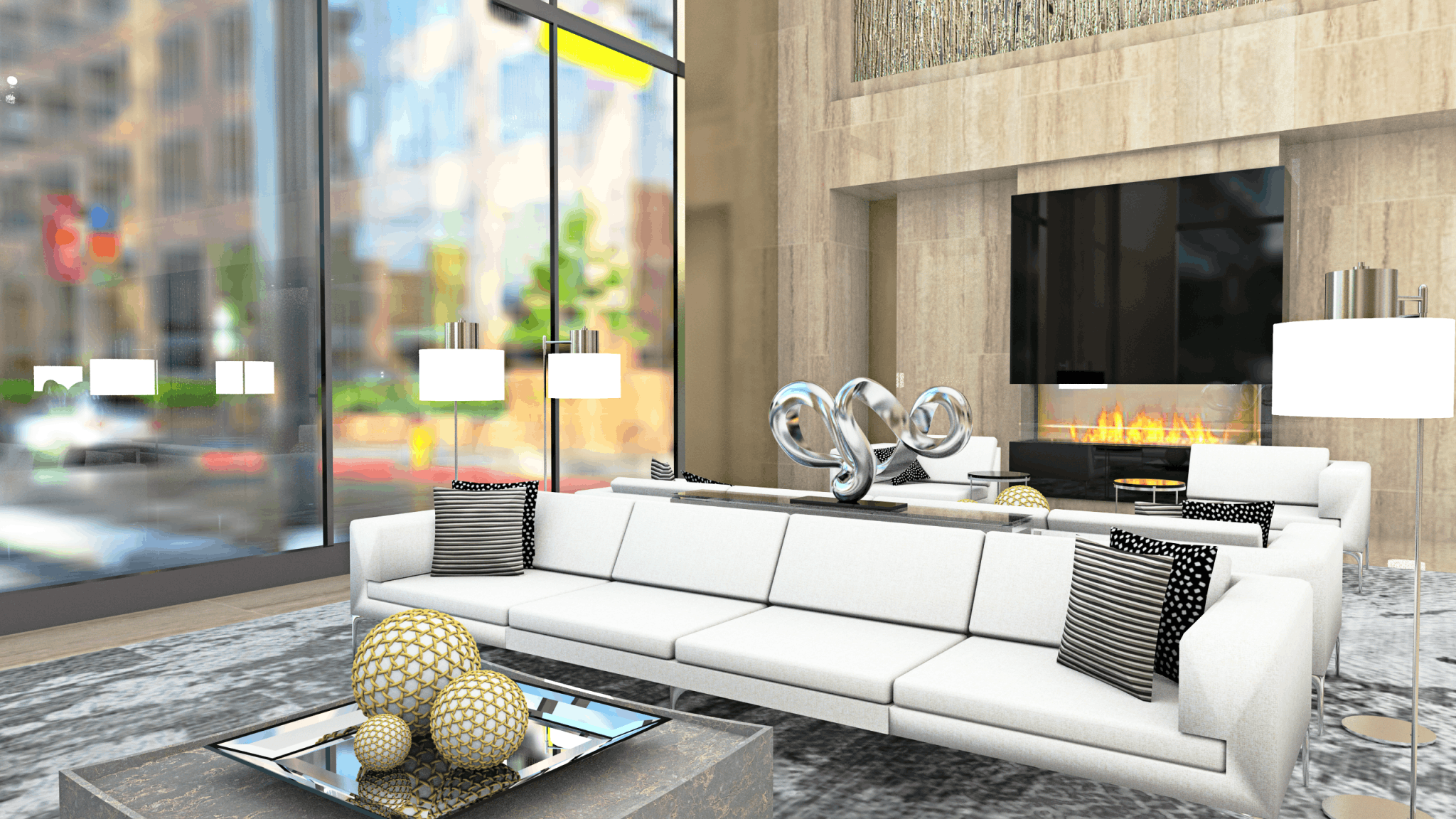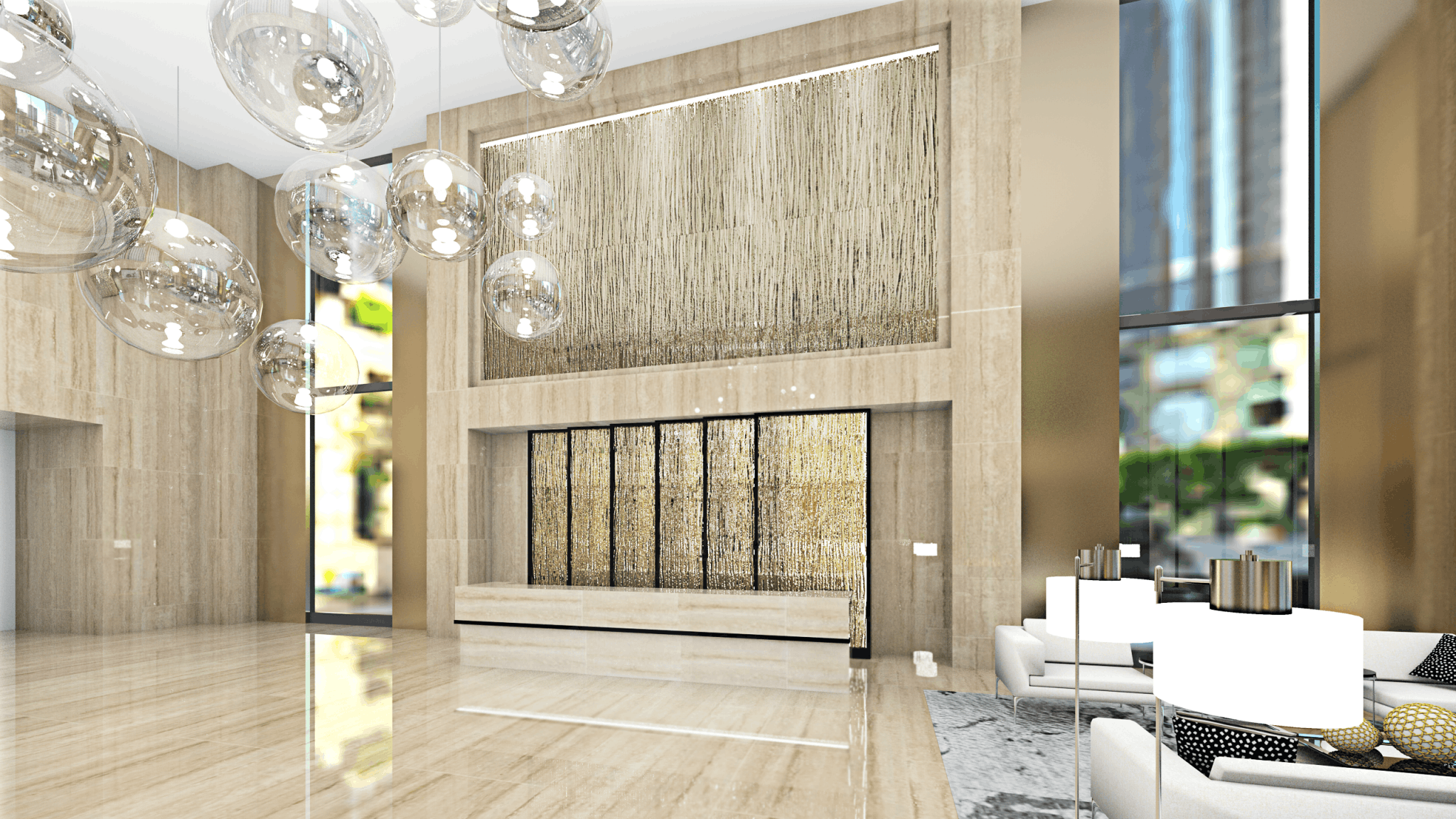 At Launch by Design Inc, we are constantly setting new standards for innovative design ideas for luxury brand hotels. Our client had requested an upscale sophisticated and luxurious design that was both clean and crisp, yet warm and inviting. This Reception Area exemplifies a contemporary architectural design. The monochromatic palette incorporates lighter warm stone work balanced by rich and bold metals creating a harmonious, visually cohesive look. The stylish finishes are perfectly paired by contemporary furniture to establish an elevated sense of luxury. The over-sized windows throughout the lobby floods the reception area with light, creating a keen sense of place and time; while the architectural lighting creates a dramatic sense of scale, drawing interest to the depth of texture of materials. The over-sized glass pendant lights tie the space together by creating a bold aesthetic with hints of chic minimalism.